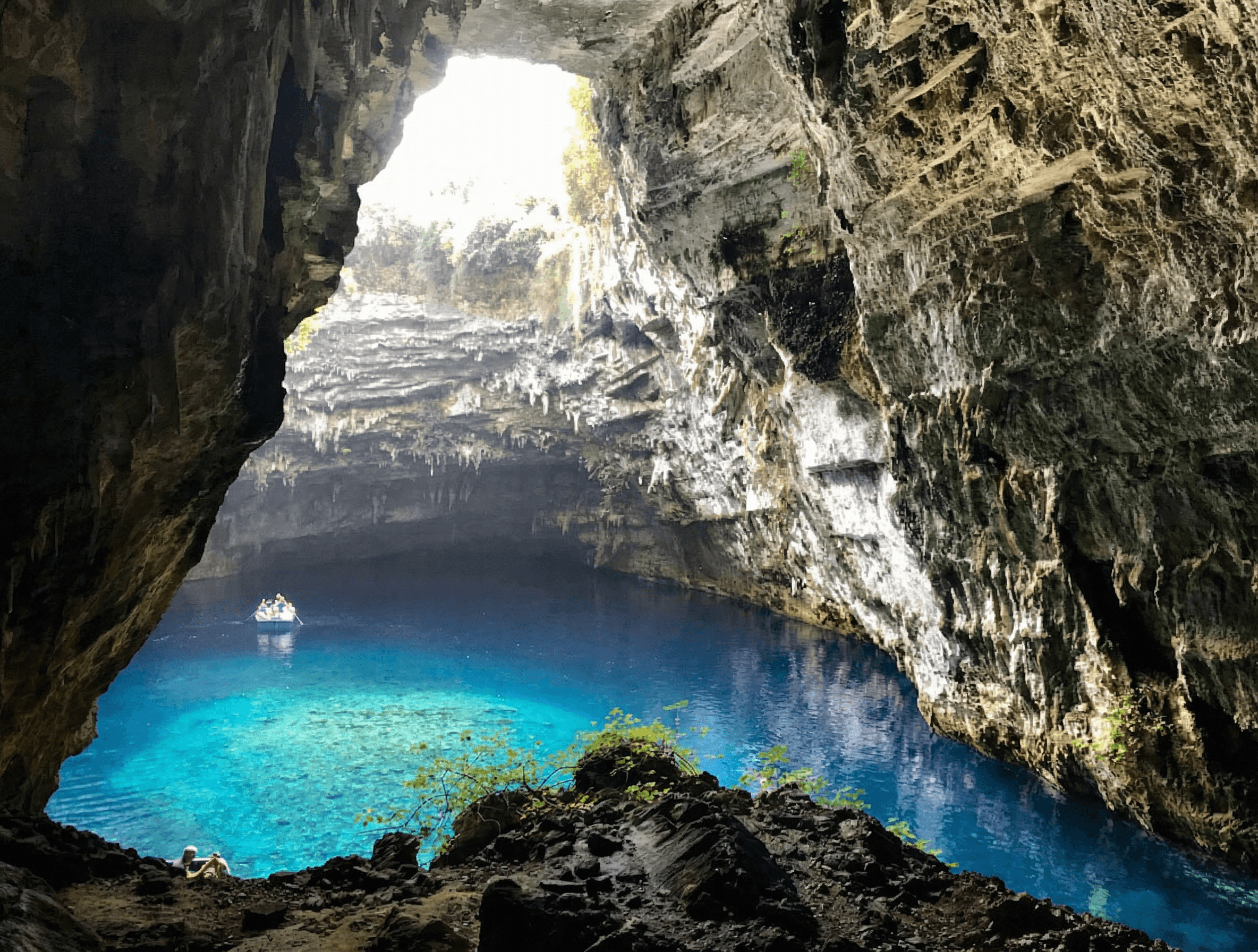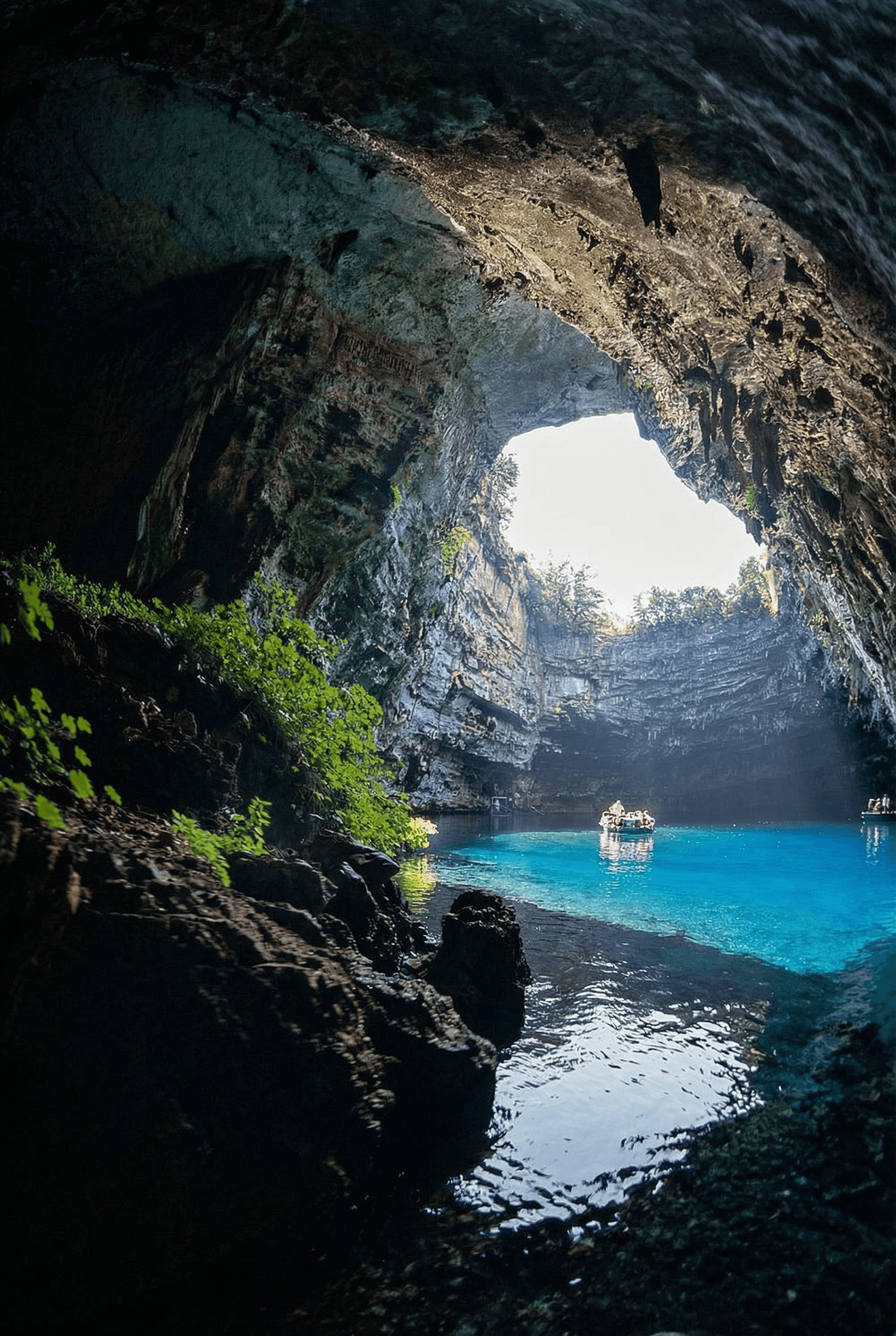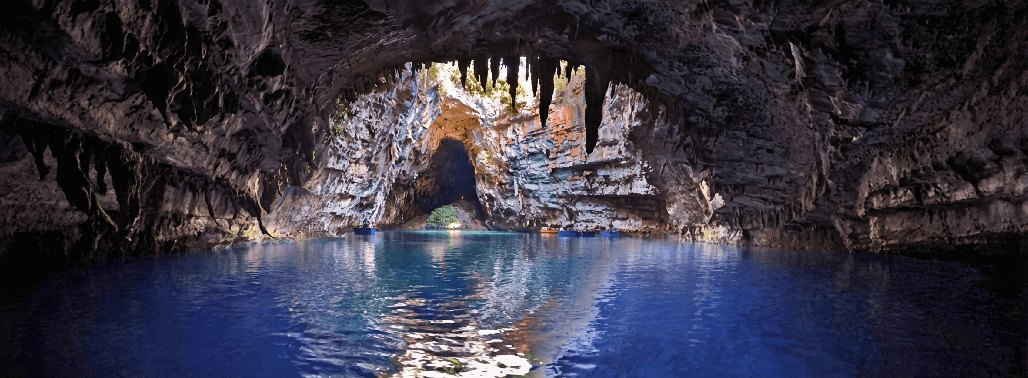 Melissani Lake Cave, located in the village of Karavomylos near Sami, Cephalonia, is identified in the sources as the Cave of the Nymphs described in Homer’s Odyssey. According to the epic, this is the site where the goddess Athena showed Odysseus the "signs of Ithaca" to convince him that he had finally returned to his homeland. The cave is situated roughly 200 meters from the shore of Sami Bay, which the sources identify as the Harbor of Phorkys.